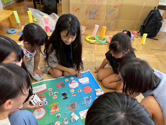意外とすごろくのルールを知っていたひかりさん。中にはお兄さん・お姉さんよりも早くゴールして「やった~!」と喜ぶお友だちもいました。ルールに戸惑っている時も優しく教えてくれました。