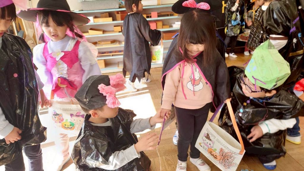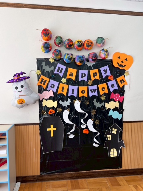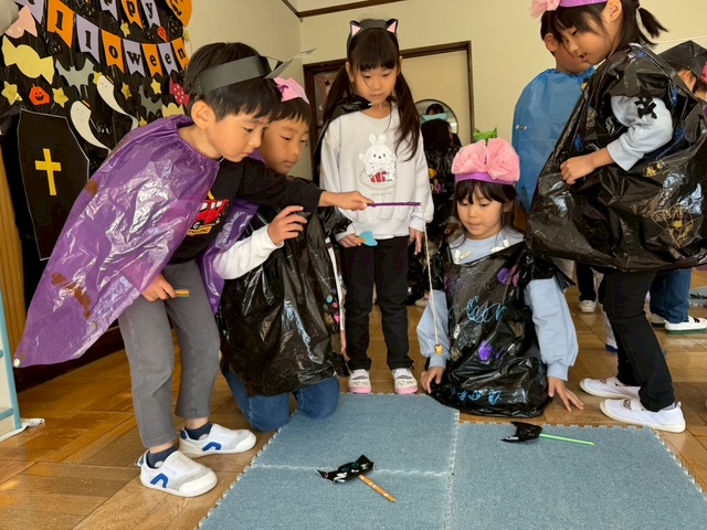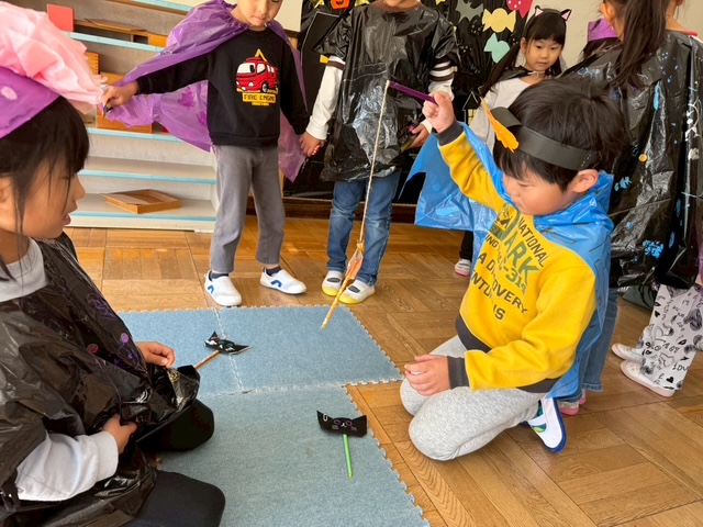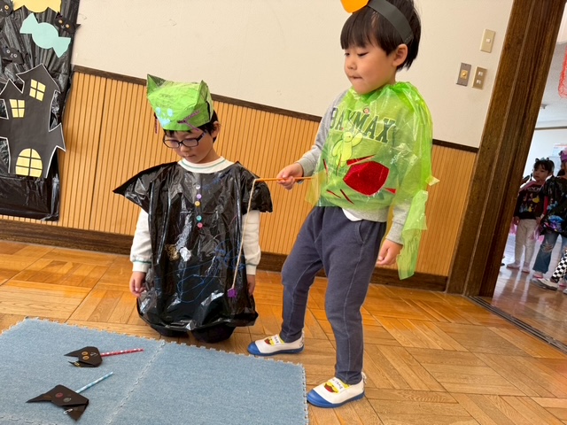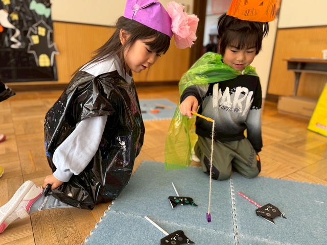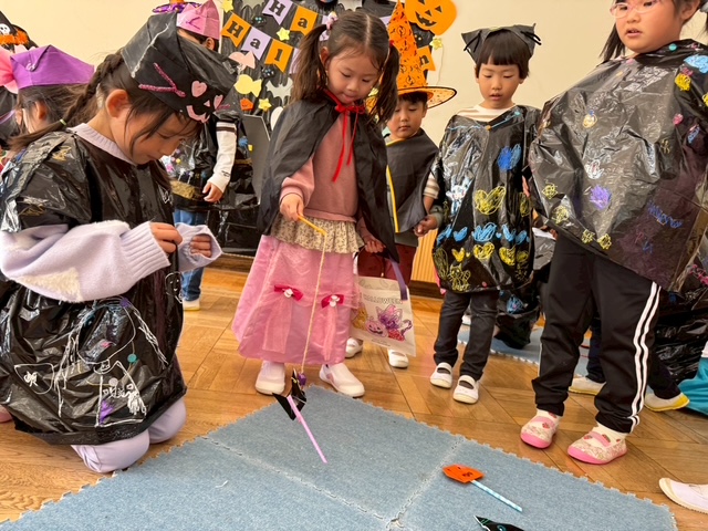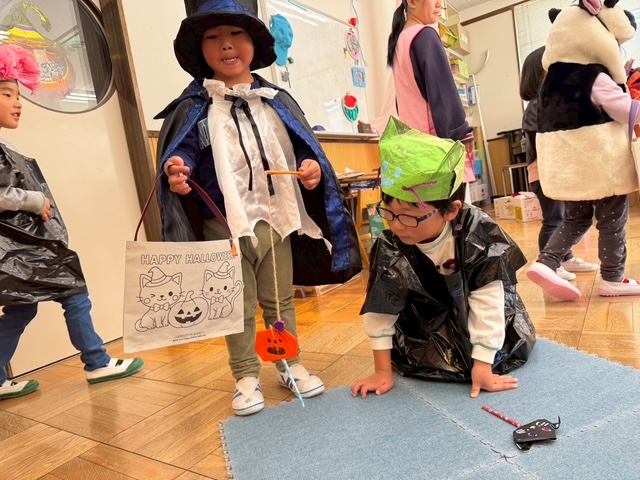 黒猫、がいこつ、かぼちゃのステッキをひかりさんが頑張って折り紙で作ってくれたので、それを磁石のついた竿で釣って、おみやげにもらいました♡