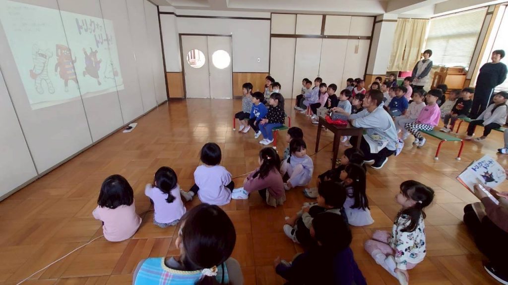 先生たちからはハロウィンが近いこともあり、「トリックオアトリート」の絵本をプロジェクターで映してもらい、読んでいただきました。