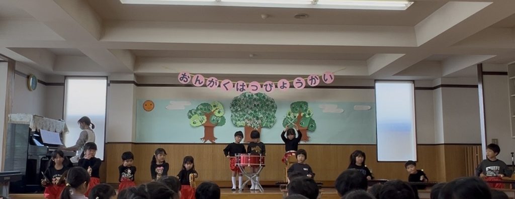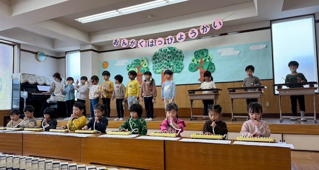 5種類の楽器に挑戦し、お友だちの音をしっかり聞いてみんなでひとつの音をつくりながら演奏しました。